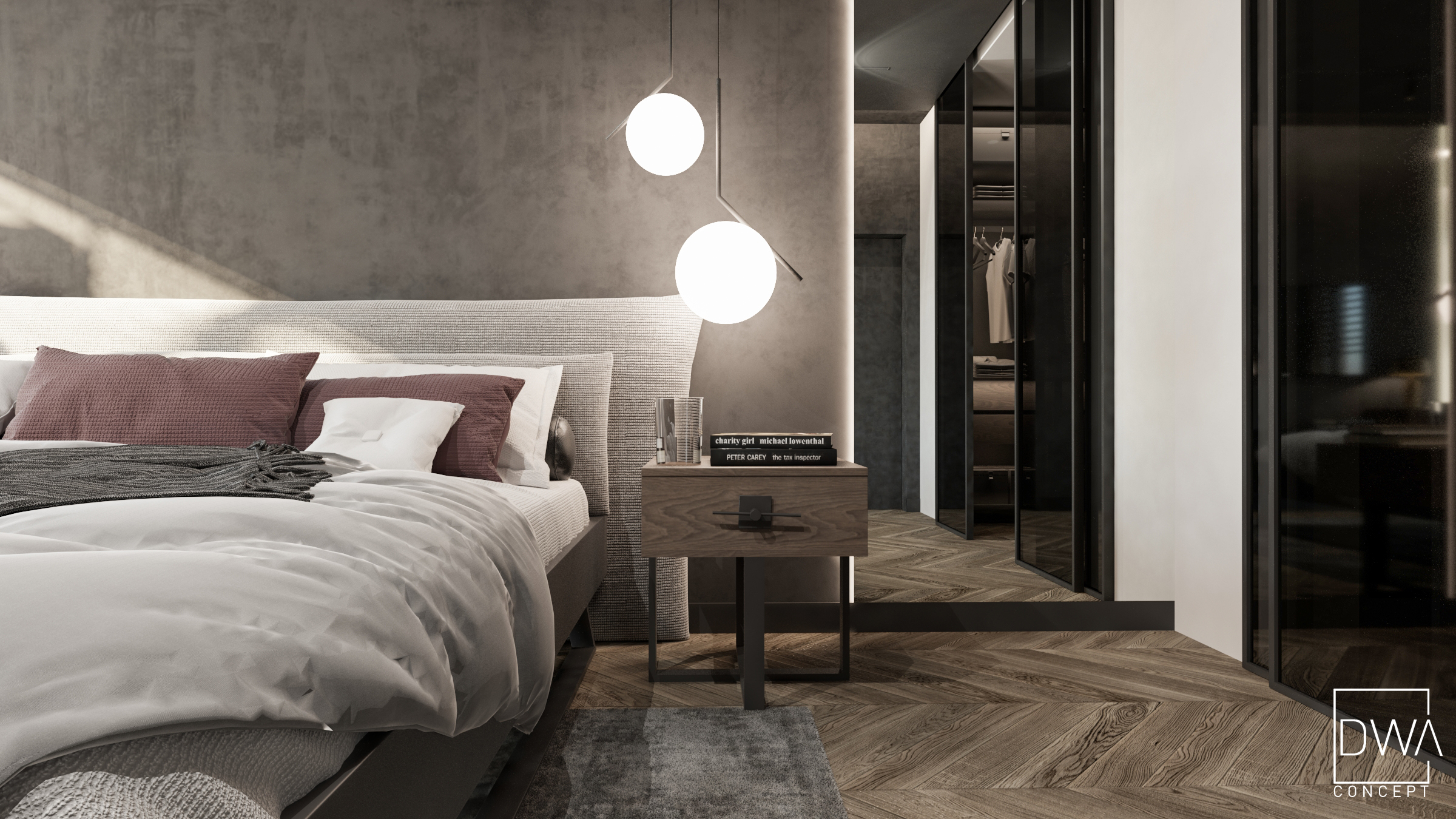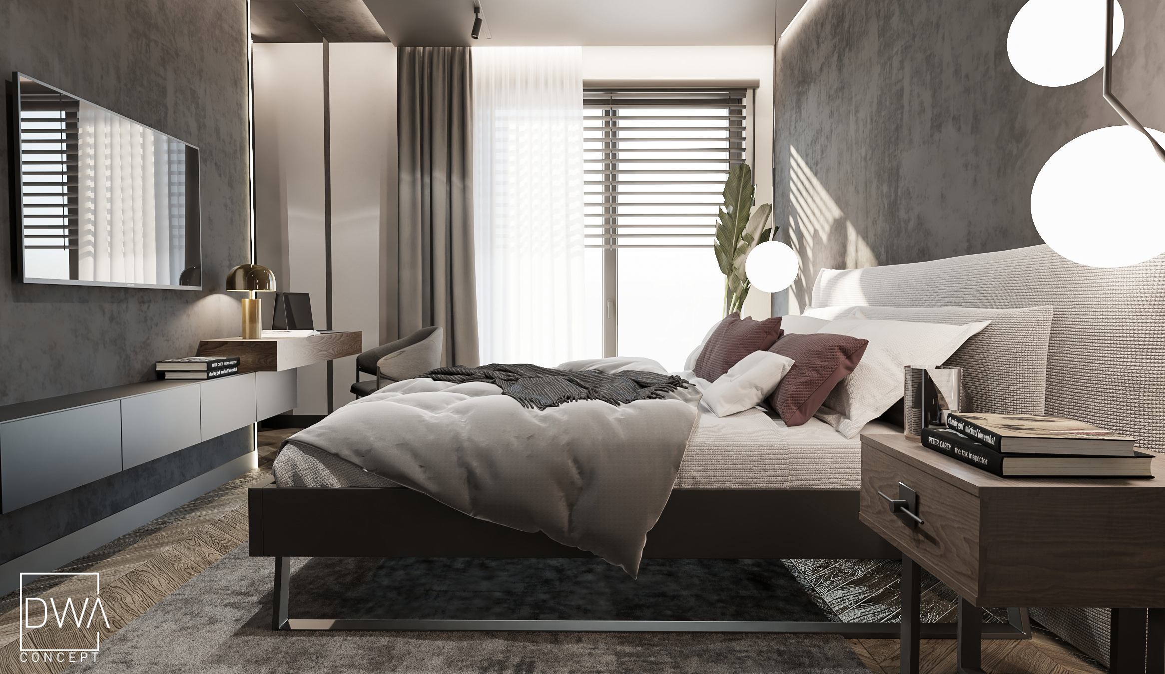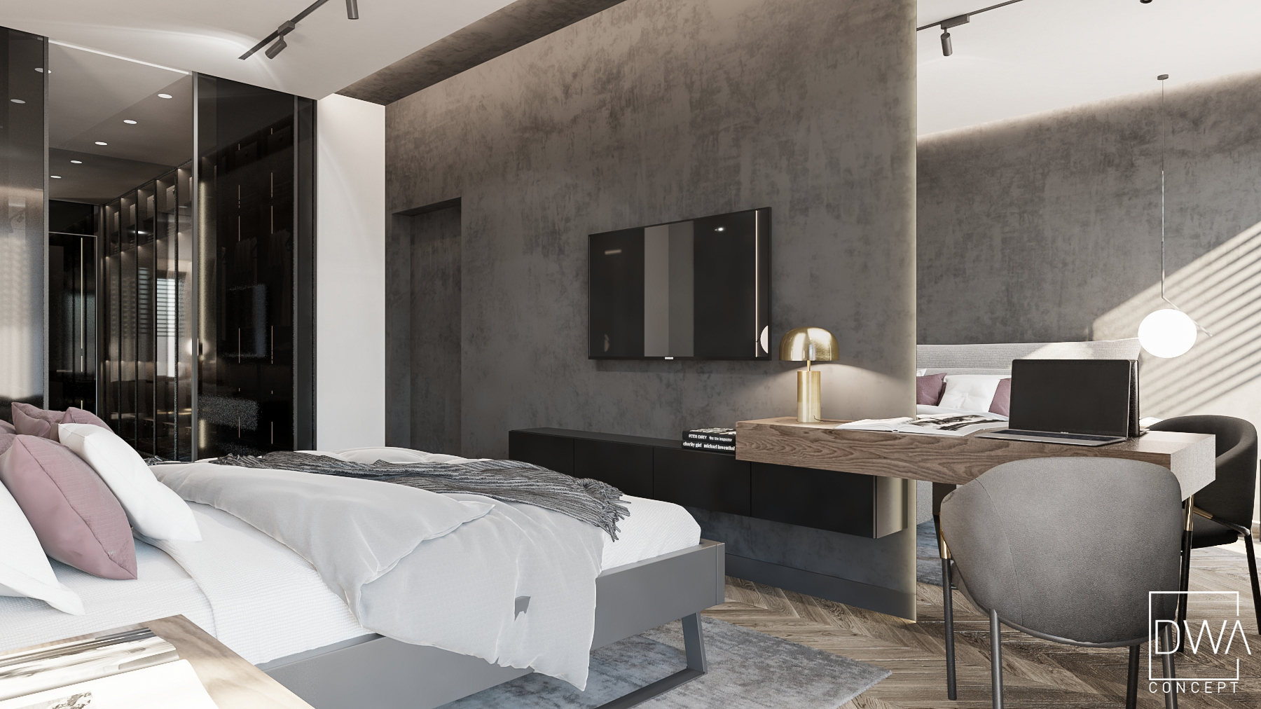 Projekt wnętrz – Strefa nocna Dom w Rabce-Zdrój. Projektowana strefa zawiera sypialnią z garderobą i łazienką.