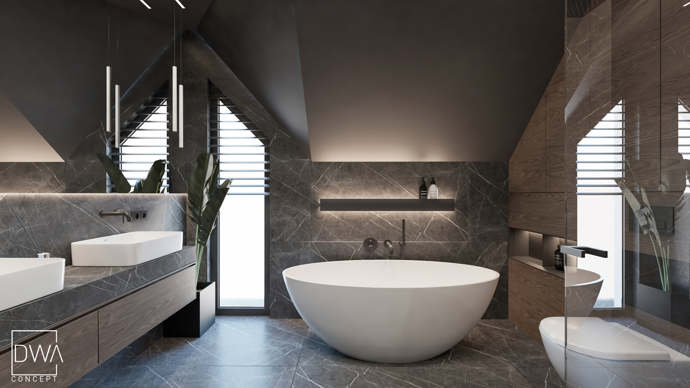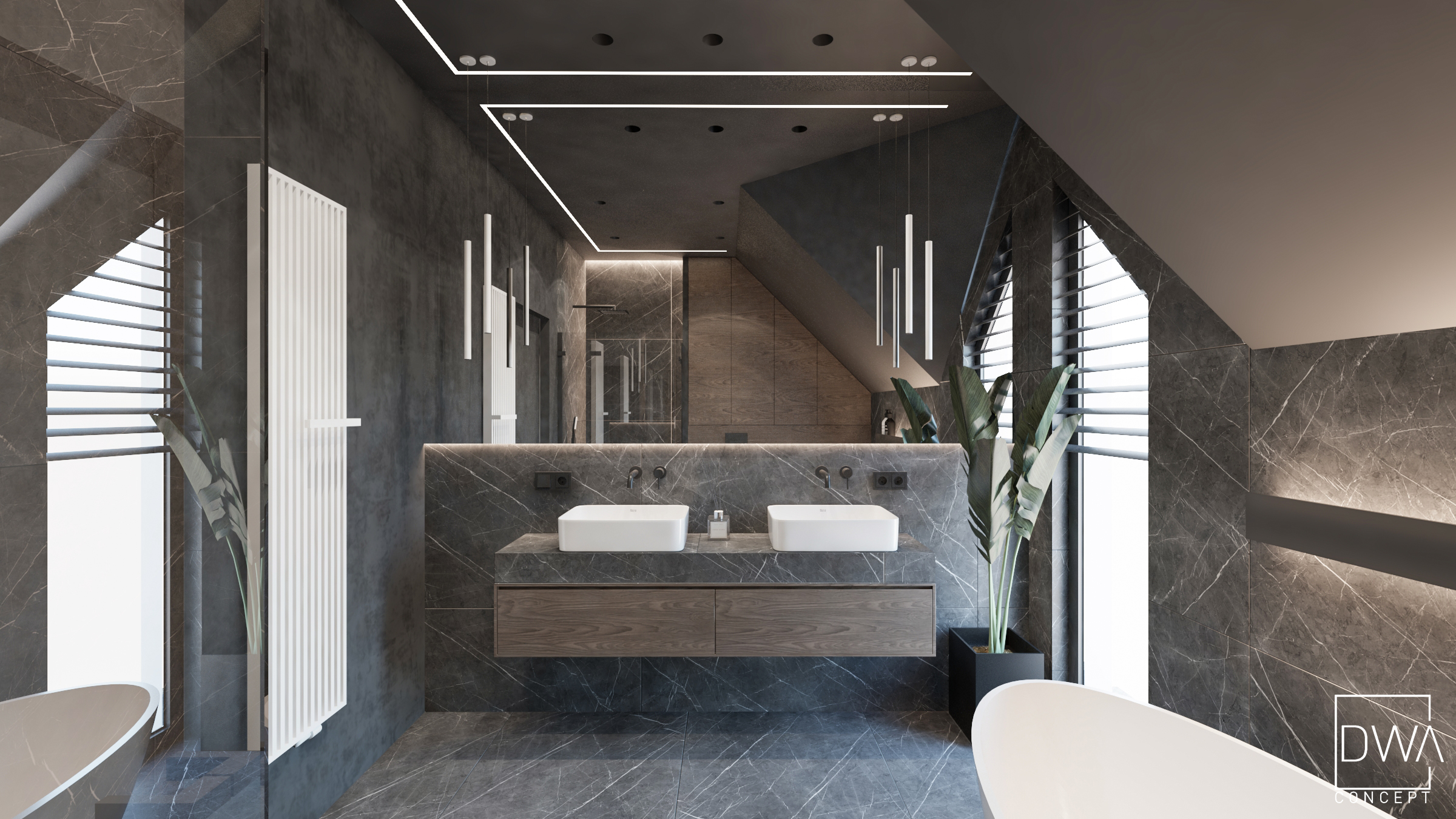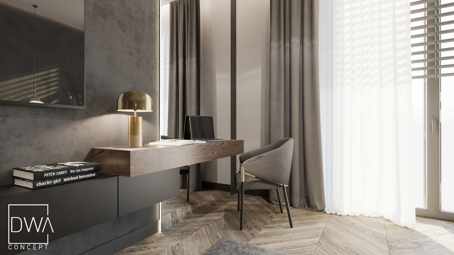 Projekt wnętrz – Strefa nocna Dom w Rabce-Zdrój. Projektowana strefa zawiera sypialnią z garderobą i łazienką.